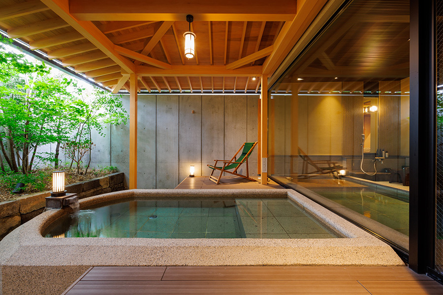 80平米の贅沢空間で愉しむ貸切温泉。まるで“誰もいない温泉地”を独り占めするかのような、非日常のひとときを。